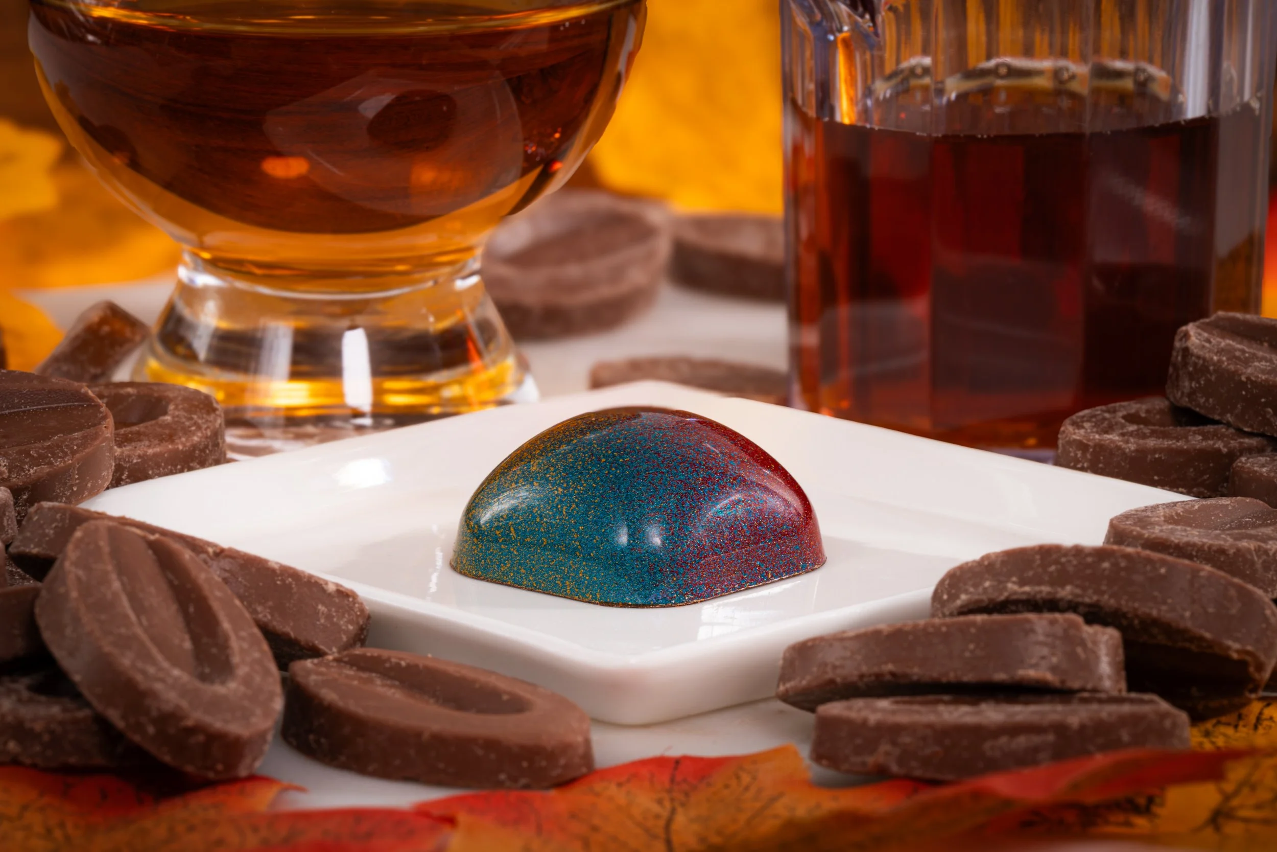 Hand-painted milk chocolate shell filled with milk chocolate ganache infused with bourbon, maple syrup and Canadian maple flavoring.