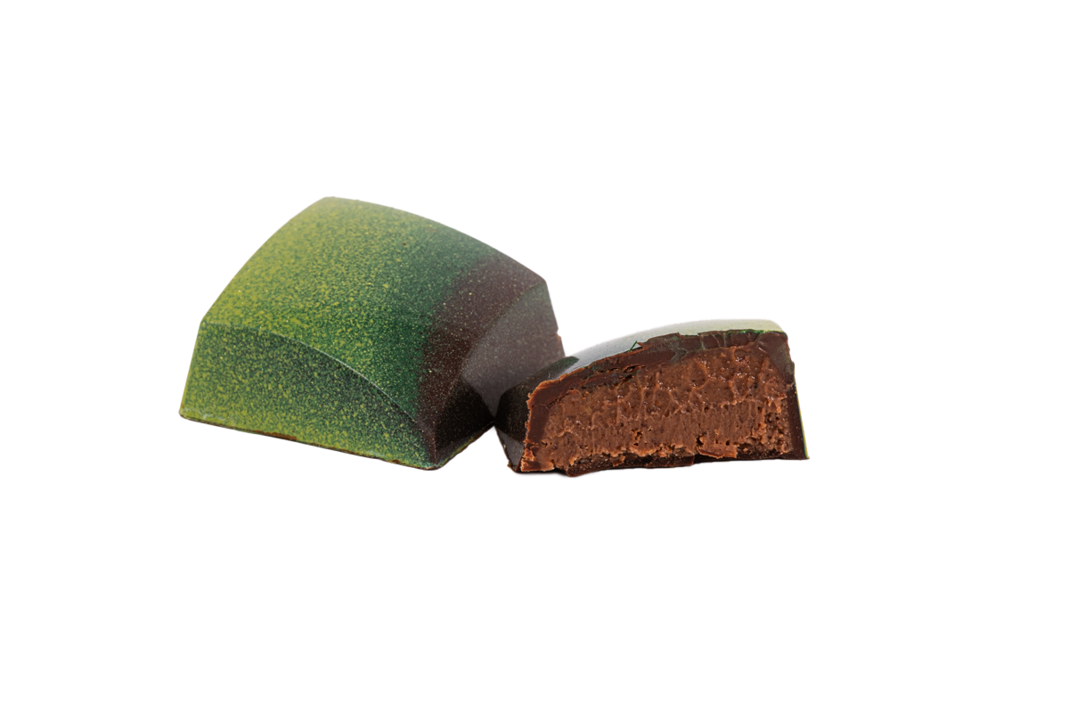 Hand-painted milk chocolate shell filled with white chocolate ganache infused with a Pear William flavoring.