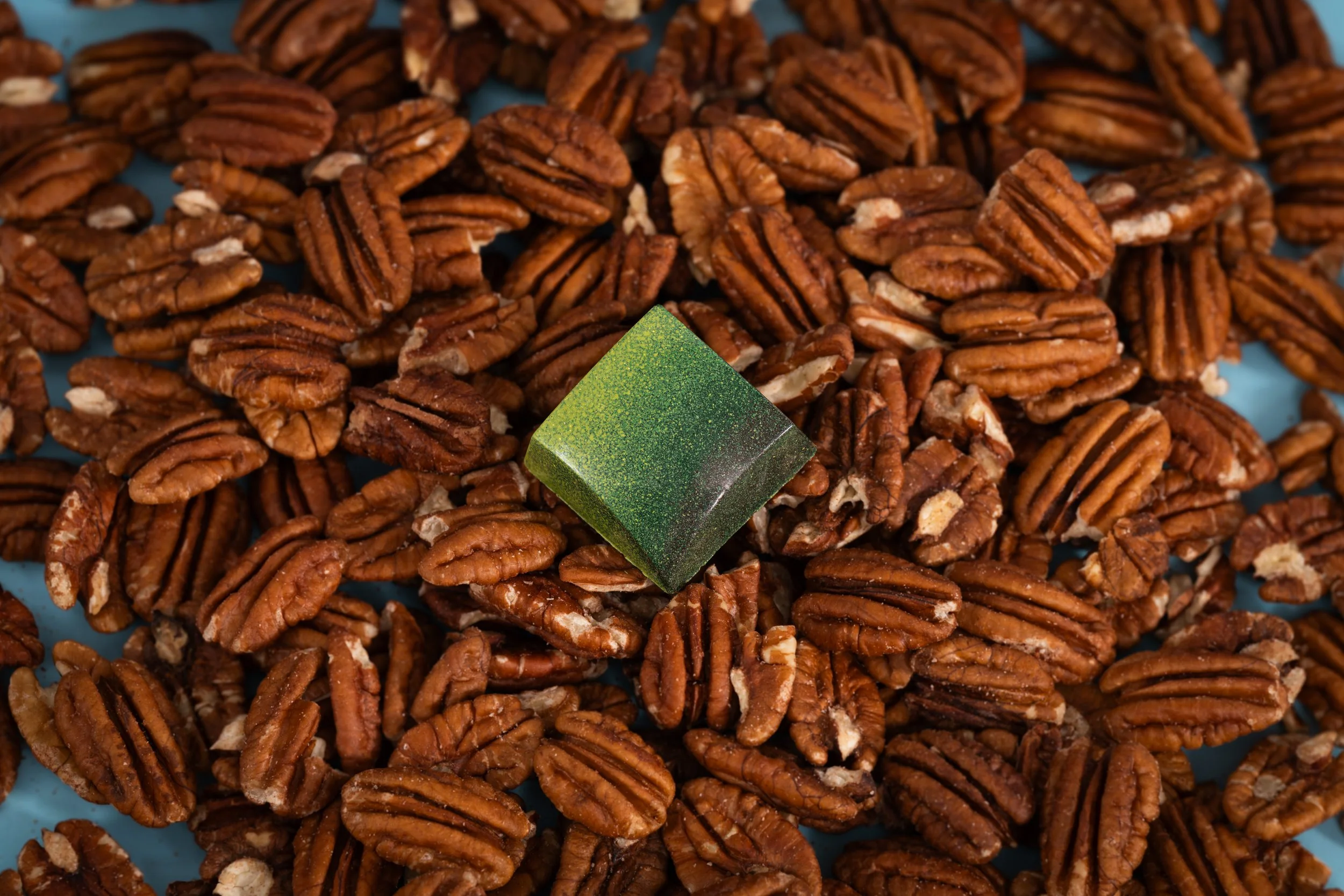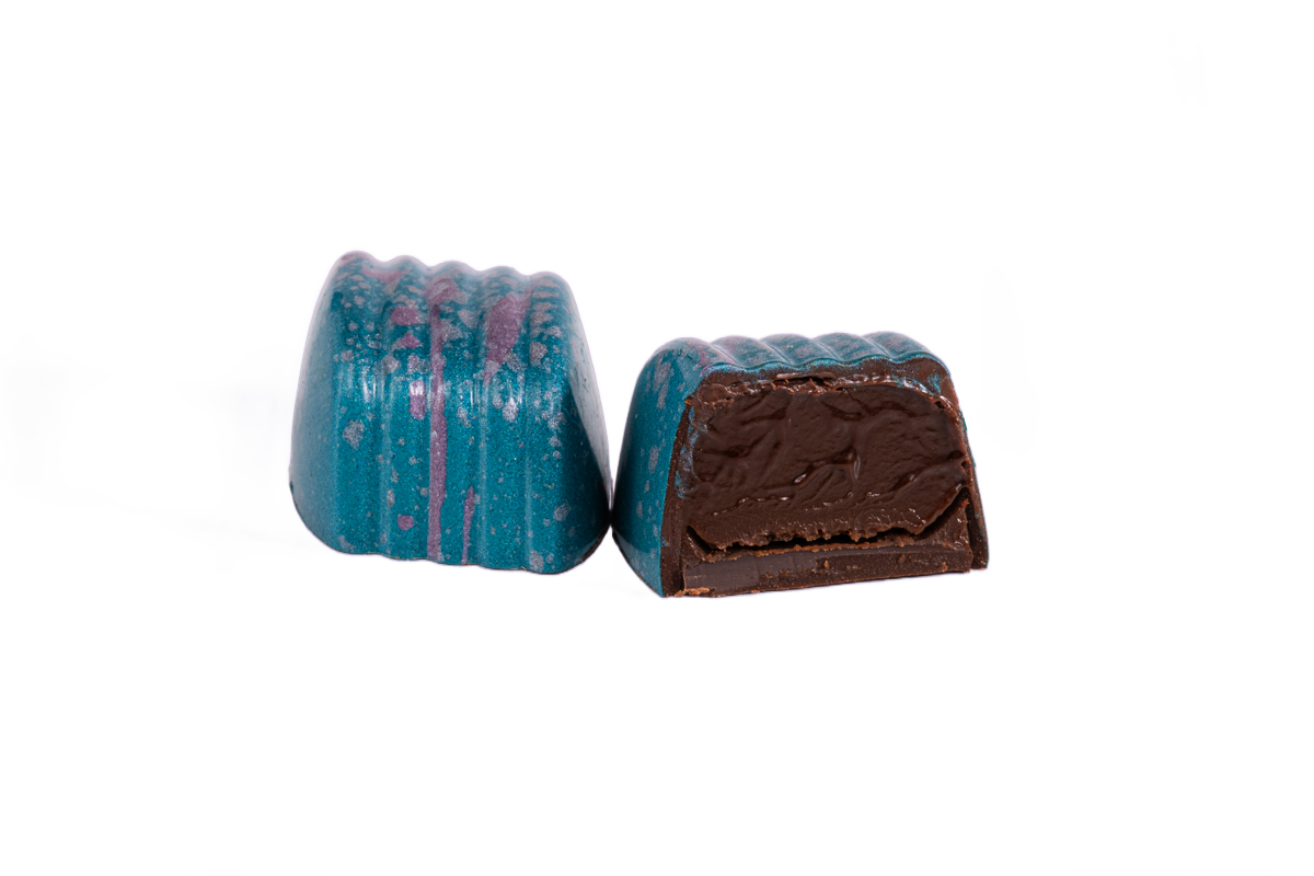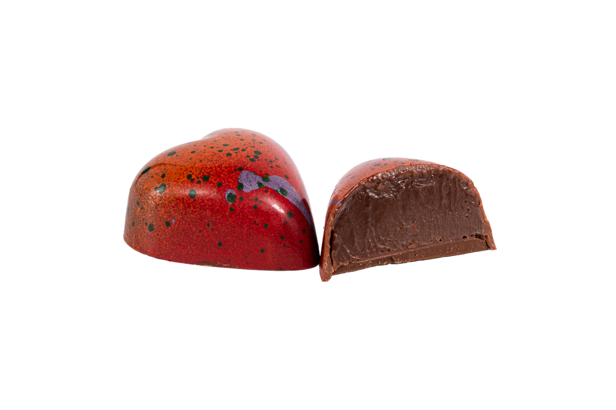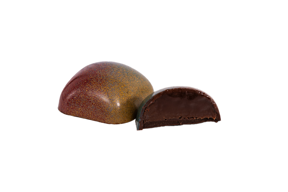 Hand-painted dark chocolate shell filled with pecan milk chocolate praline.