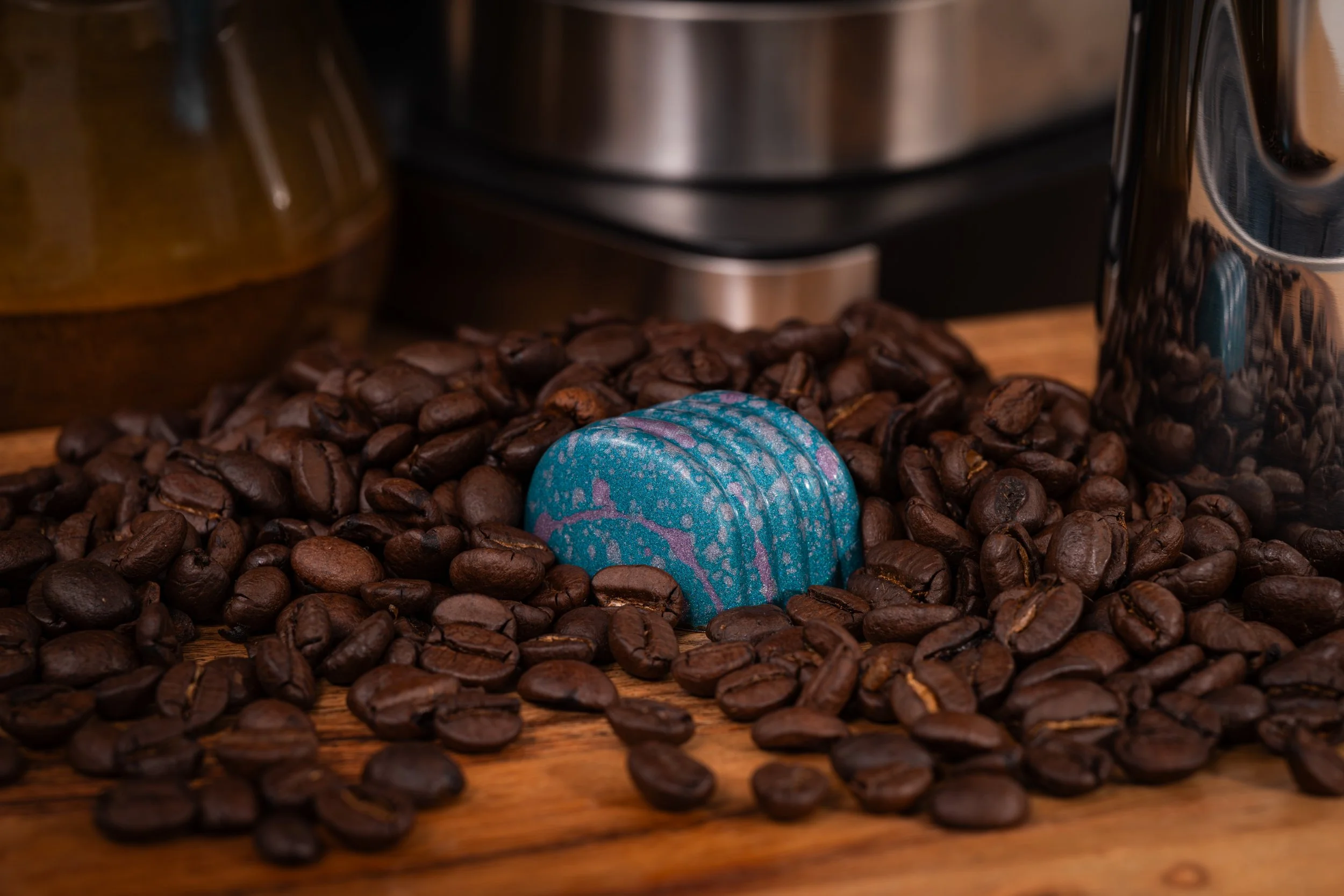Hand-painted dark chocolate shell filled with milk chocolate ganache infused with coffee flavoring.
